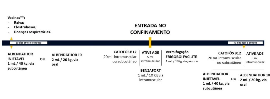 O manejo sanitário dos animais deve iniciar 30 dias antes da entrada do confinamento. Nesse período, os bovinos devem receber a primeira vacinação contra as principais doenças respiratórias, clostridioses e raiva. Além disso, é importante a administração de anti-helmíntico à base de Albendazol, eficaz no combate e no controle das principais verminoses gastrointestinais e pulmonares, agindo nas três fases do ciclo de vida dos parasitos (ovos, larvas e adultos).